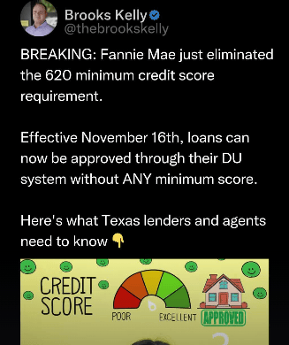 Fannie Mae removed the minimum credit score requirement from Desktop Underwriter (DU). Instead, DU will weigh a borrower’s entire risk profile: income stability, payment patterns, assets, LTV, DTI, etc.